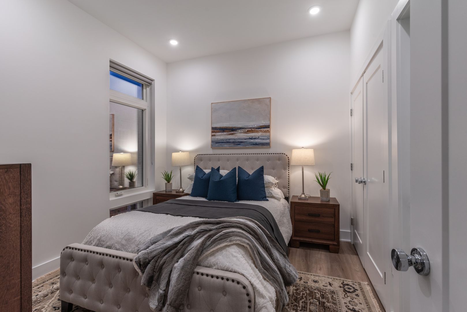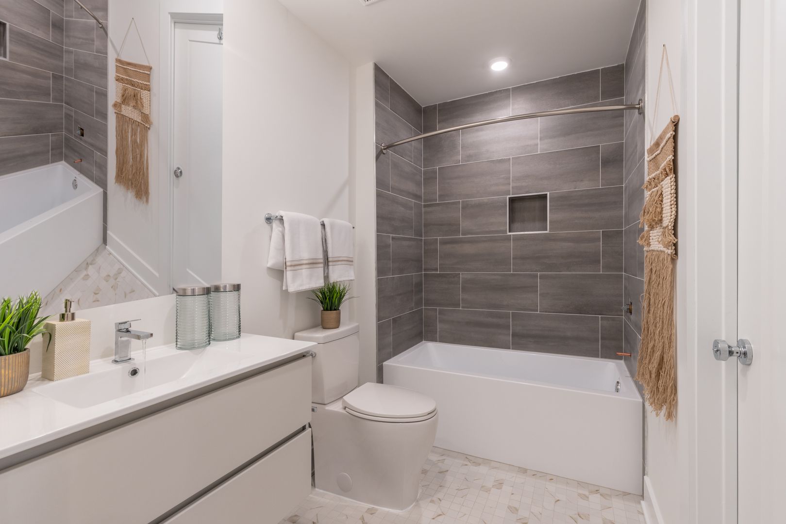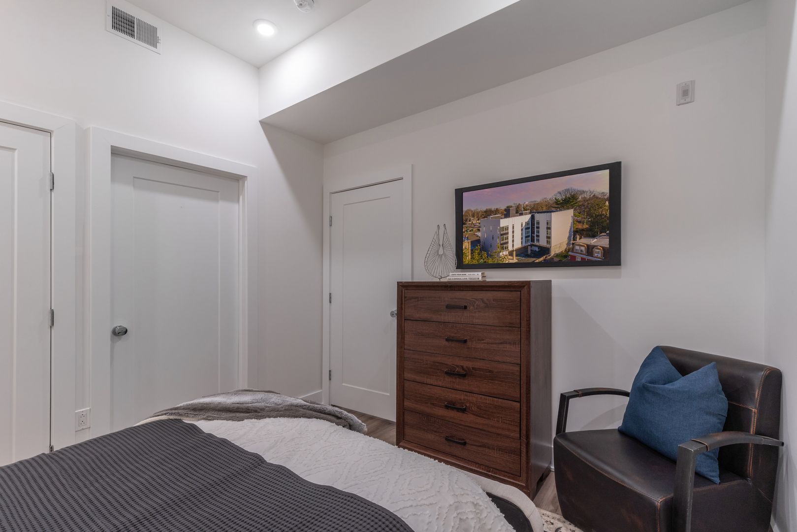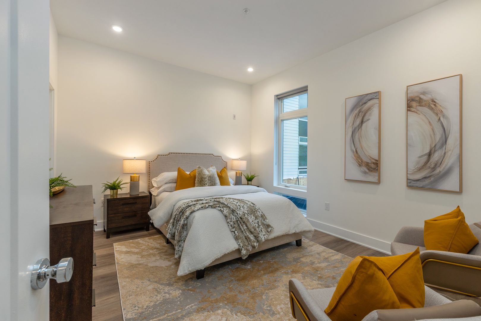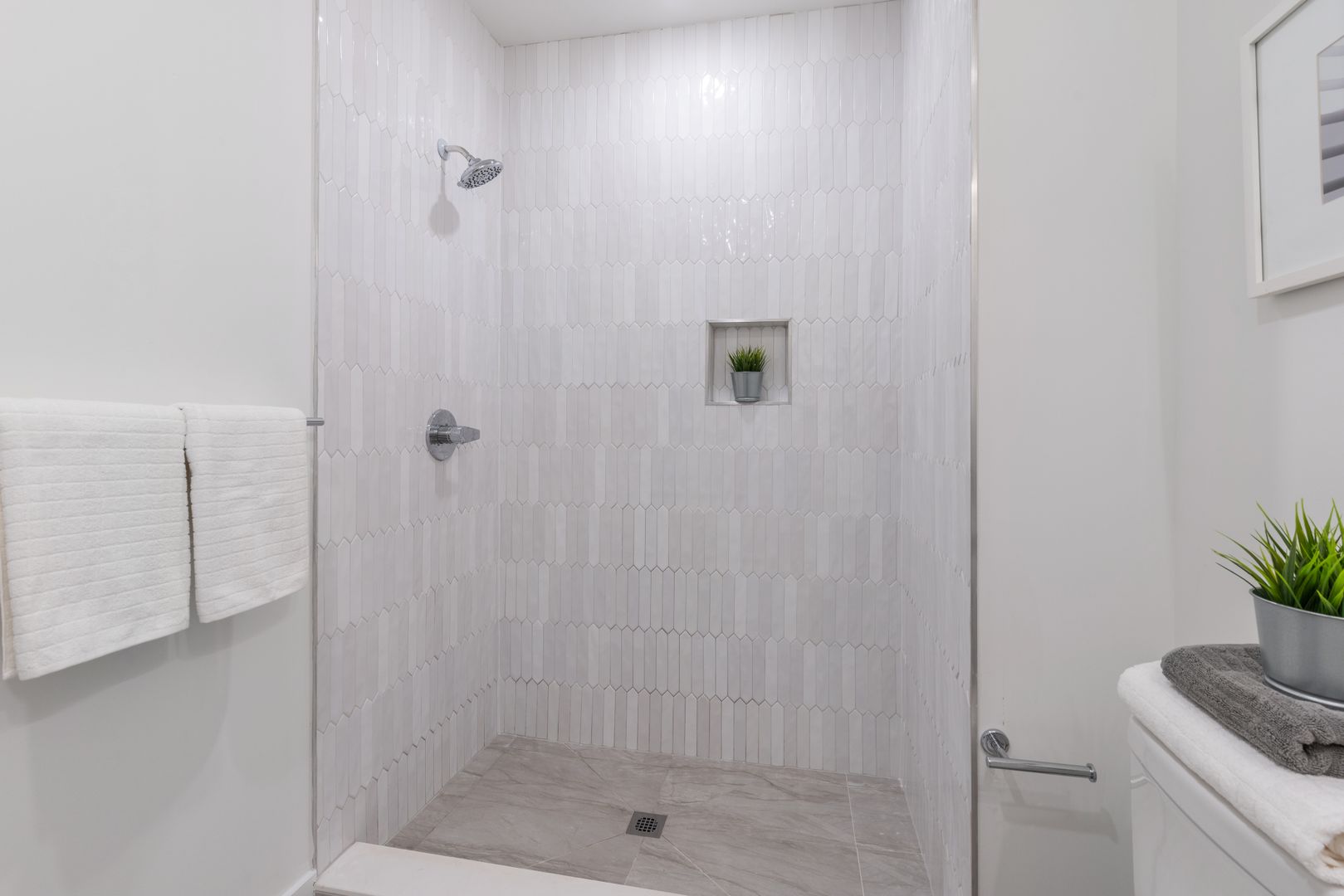 Each apartment offers 12 foot ceilings and is equipped with a breakfast bar with sleek white countertops, modern shaker cabinetry, high end Whirlpool stainless appliances, floating bathroom vanities, glass enclosed showers, custom California styled built out closets, and tons of natural lighting from the massive windows throughout the unit.
